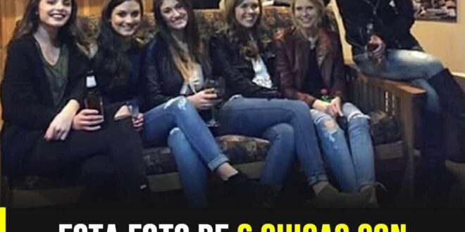 A primera impresión, la fotografía parece normal. Se observan seis jóvenes sentadas una junto a la otra, posando para la cámara. Sin embargo, al detenerse en la parte inferior de la imagen surge el detalle que dispara la confusión: solo se distinguen cinco pares de piernas. La pregunta surge de inmediato: ¿dónde están las piernas que faltan?