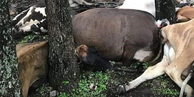 Pero cuando regresaron horas más tarde, la escena que encontraron los dejó sin palabras. Sus 32 vacas yacían sin vida, amontonadas en un solo lugar. Un veterinario que inspeccionó la situación confirmó que la causa había sido un rayo. Según explicó, es común que las tormentas eléctricas representen un riesgo para los animales en espacios abiertos, pero el impacto de este caso fue inusual por la cantidad de ganado afectado de una sola vez.